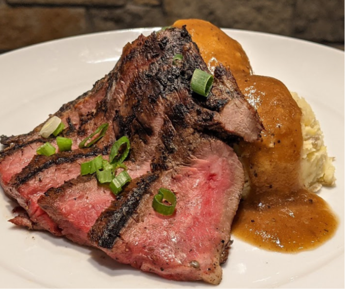 Tender cuts of medium-rare steak served with a side of mashed potatoes and gravy.