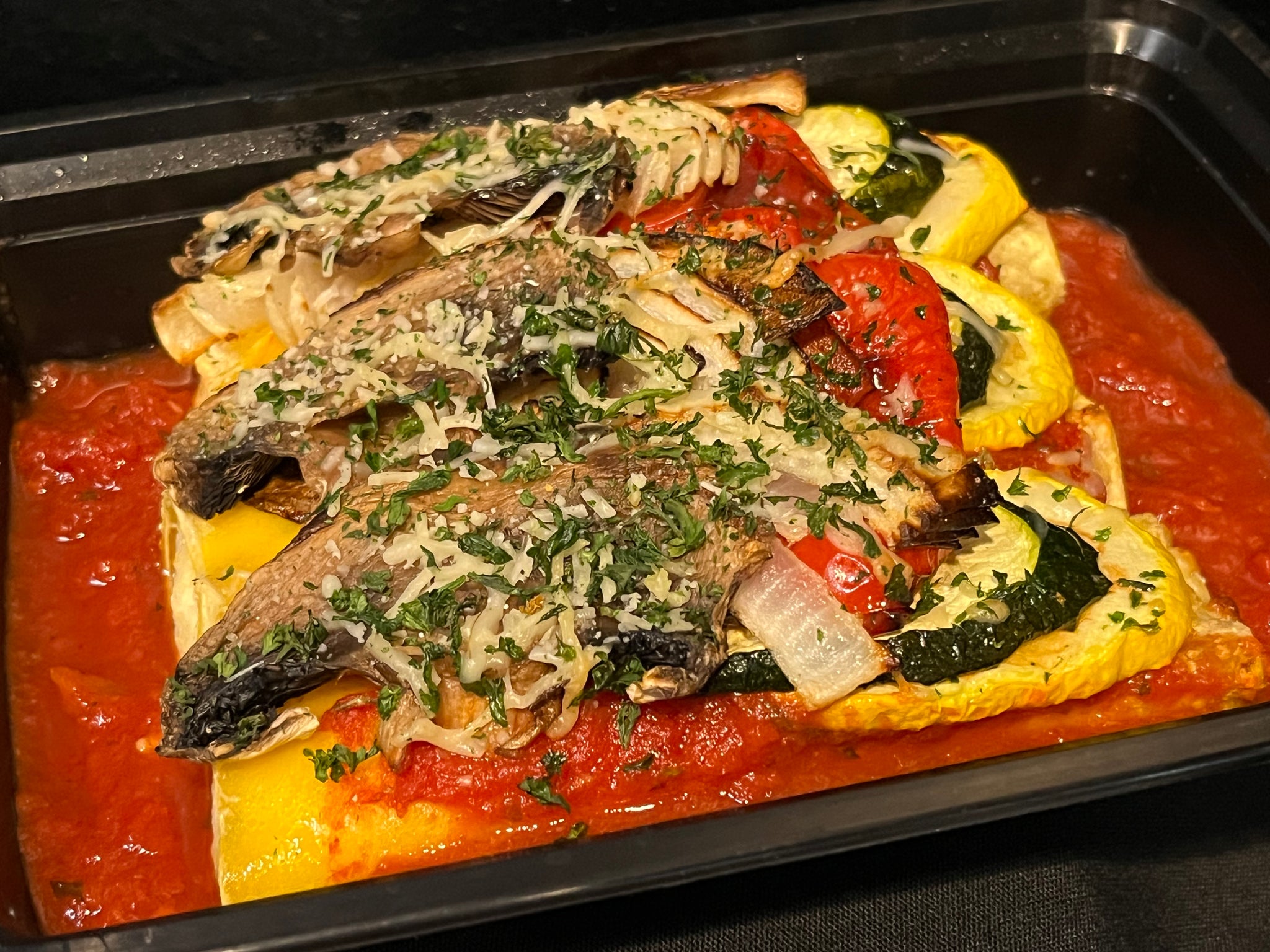 We stuff 3 of these “little sleeves” with rich ricotta, top them with homemade marinara, sliced roasted vegetables, Parmesan cheese, and then baked.
